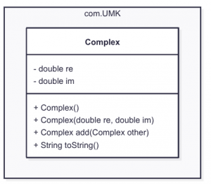 package com.UMK; // nazwa pakietu public class Complex { // nazwa klasy private double re; // pola składowe private double im; public Complex() { // konstruktor domyślny this.re = 0.0; this.im = 0.0; } public Complex(double re, double im) { // konstruktor z parametrami this.re = re; this.im = im; } public String toString() { // metoda return re + " + " + im + "i"; } // ... }