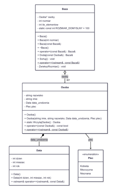Obiekt klasy Baza przechowuje zbiór rekordów (obiektów klasy Osoba) oraz pozwala na manipulację zawartością i wyświetlanie bazy danych. Rekordy przechowywane są w dynamicznie tworzonej tablicy, która jest powiększana w miarę dodawania nowych rekordów.