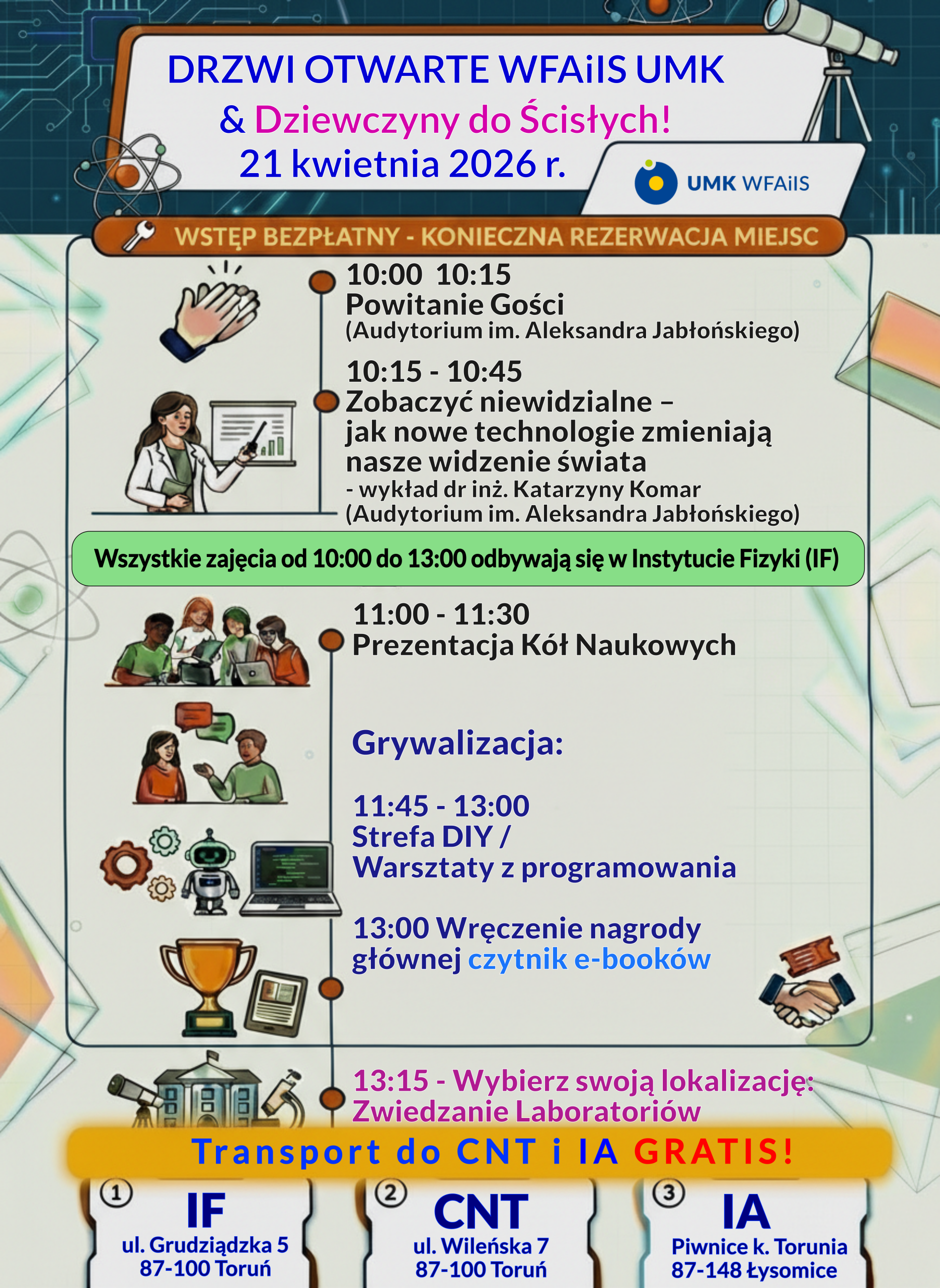 Czy technologia to dla Ciebie czarna magia, czy zestaw narzędzi do zmieniania świata? Przyjdź na Wydział Fizyki, Astronomii i Informatyki Stosowanej UMK i przekonaj się, że przyszłość ma Twoją twarz. Czekamy na Ciebie przy ul. Grudziądzkiej 5 w Toruniu!