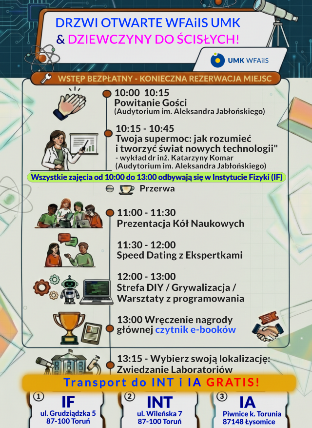 Zacznij od inspirującego wykładu dr hab. Katarzyny Komar, prof. UMK, która udowodni Ci, że zrozumienie fizyki i informatyki to klucz do kreowania rzeczywistości, o jakiej inni tylko czytają w książkach sci-fi. Poznaj nasze Koła Naukowe i przekonaj się, że studia to nie tylko książki, ale budowa robotów, badanie egzoplanet i łamanie kodów.