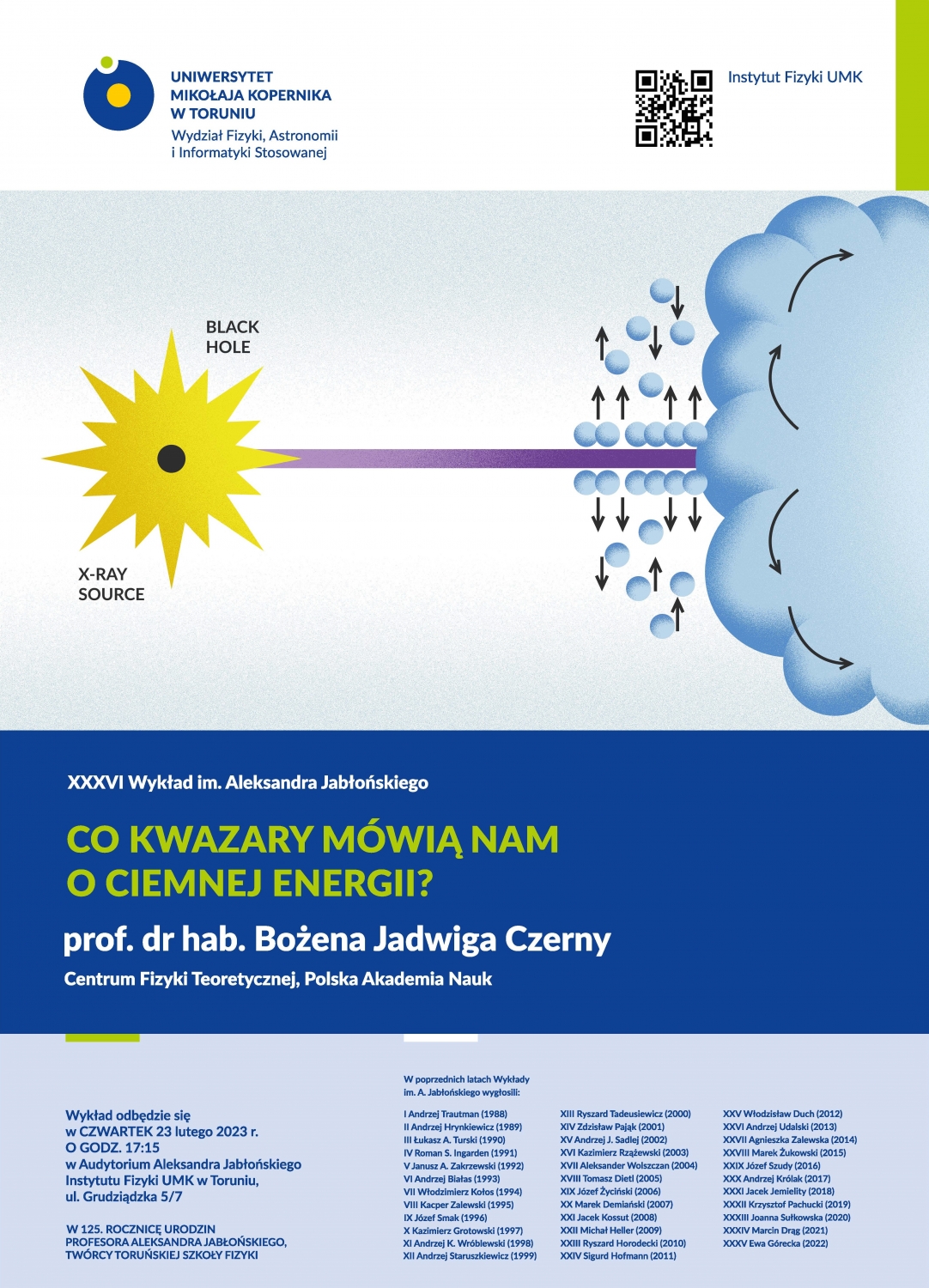 Już 23 lutego 2023 roku o godzinie 17:15 w Audytorium Aleksandra Jabłońskiego (Instytut Fizyki UMK, ul. Grudziądzka 5/7) w ramach corocznego Wykładu im. Aleksandra Jabłońskiego prof. dr hab. Bożena Jadwiga Czerny (Centrum Fizyki Teoretycznej PAN) wygłosi wykład pt. „Co kwazary mówią nam o ciemnej energii?".