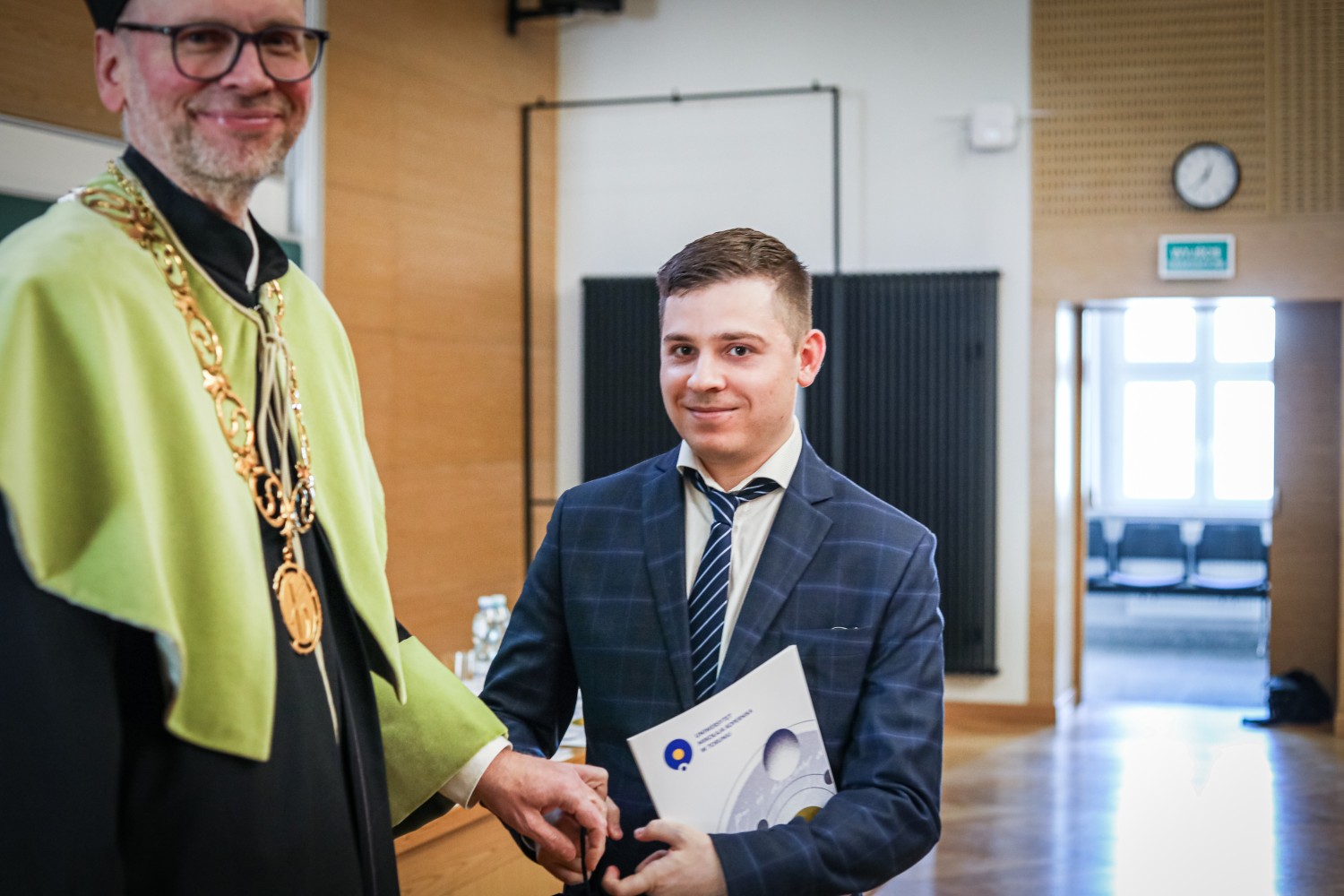 • mgr inż. Marcin Makowski ukończył studia na fizyce technicznej ze średnią ocen 4,97. Brał aktywny udział w trzech projektach w zespole prof. dr. hab. Piotra Wcisło z Instytutu Fizyki: w grancie Europejskiej Rady ds. Badań Naukowych (ERC) "Nowe eksperymentalne metody wychwytywania zimnego wodoru cząsteczkowego" oraz grantach Narodowe Centrum Nauki OPUS dotyczące ultradokładnej spektroskopii prostych molekuł i rozpraszania kwantowego optycznie wzbudzonych molekuł. Brał udział w konferencjach High Resolution Molecular Spectroscopy 2023 (Dijon, Francja), 2024 (Bolonia, Włochy), 2025 (Kolonia, Niemcy) i jest współautorem publikacji „Cavity-enhanced spectroscopy in the deep cryogenic regime” - brał udział w budowie systemu pomiarowego opartego o spektrometr kriogeniczny i zbierał dane pomiarowe. Pan mgr inż. Marcin Makowski to stypendysta Ministerstwo Nauki i Szkolnictwa Wyższego 2023/2024, Prezydenta Miasta Torunia 2024/2025, JM Rektora 2024/2025. Rada doceniła działalność na rzecz społeczności Uczelni, m.in. jako członek jury nagrody młodych w Konkursie Fizyka, Astronomia, Studia Techniczne. Pan Marcin był także Najlepszym Absolwentem naszego Wydziału w 2023/2024 jako absolwent studiów inżynierskich!