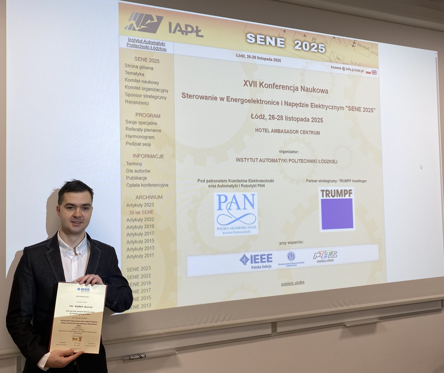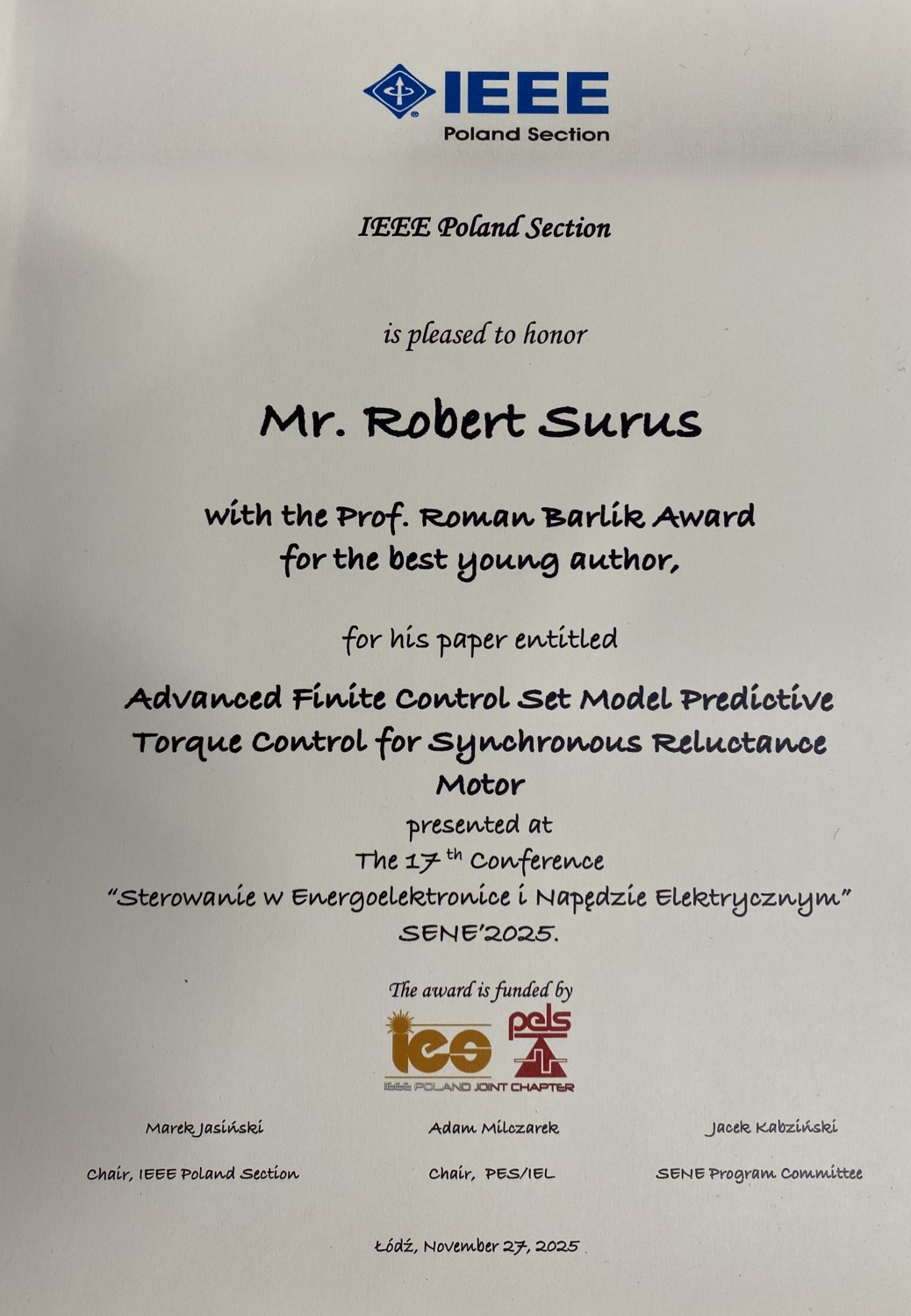 Mgr inż. Robert Surus z Instytutu Nauk Technicznych, asystent w Katedrze Automatyki i Systemów Pomiarowych, otrzymał nagrodę imienia Profesora Romana Barlika dla najlepszego młodego autora podczas XVII Konferencji Naukowej Sterowanie w Energoelektronice i Napędzie Elektrycznym "SENE 2025" organizowanej przez Instytut Automatyki Politechniki Łódzkiej w dniach 26-28 listopada 2025.