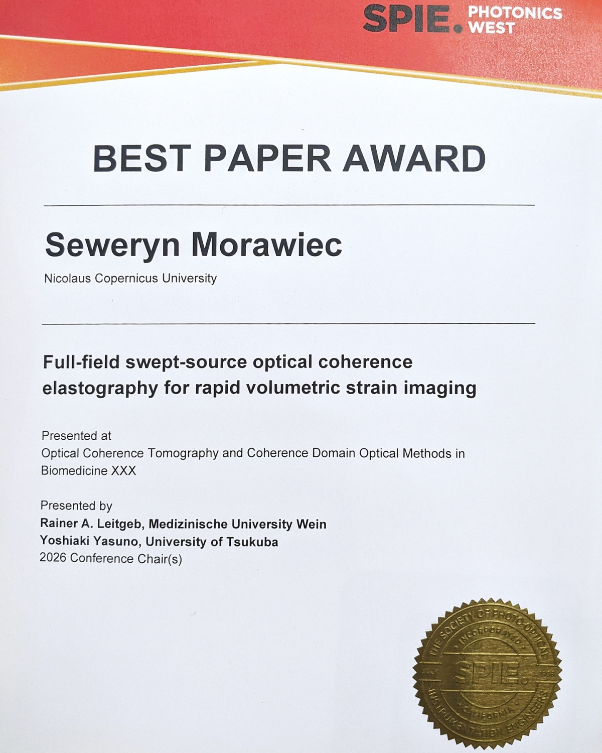 Dr inż. Seweryn Morawiec otrzymał nagrodę Best Paper Award za najlepszą prezentację podczas międzynarodowej konferencji SPIE Photonics West 2026, w ramach konferencji tematycznej Optical Coherence Tomography and Coherence Domain Optical Methods in Biomedicine XXX.