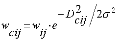 Multiply previous weight wij by a Gaussian-like term centered on Pc, decreasing when the mean distance